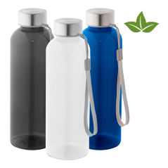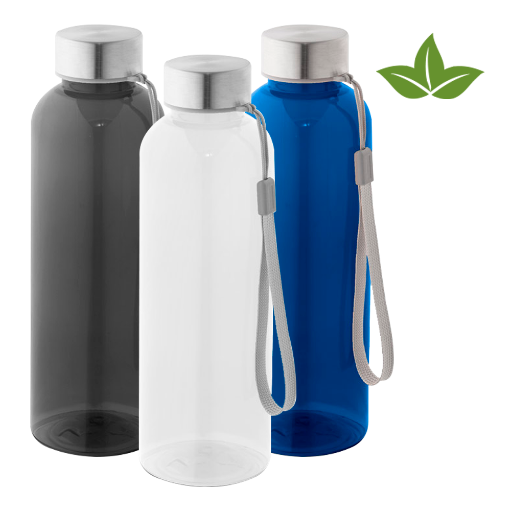 Botella de PET reciclado (100% rPET) . Tapa de acero inoxidable a prueba de fugas con cuerda de poliéster para facilitar su transporte. Capacidad de hasta 600 ml. ø65 x 210 mm.