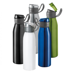 Botella fabricada en aluminio con tapa de AS y asa para facilitar el transporte. Capacidad de hasta 650 ml. ø66 x 250 mm.